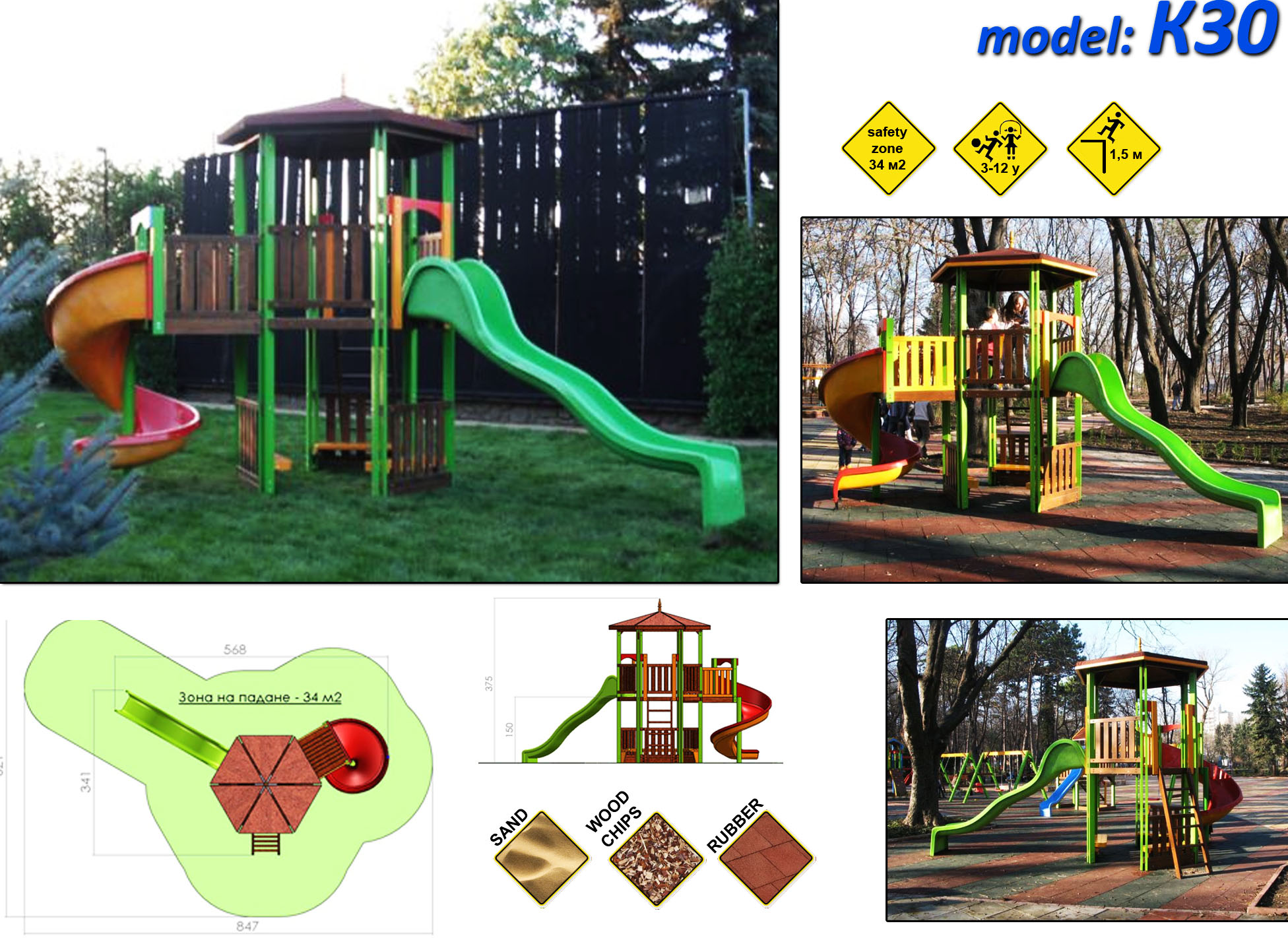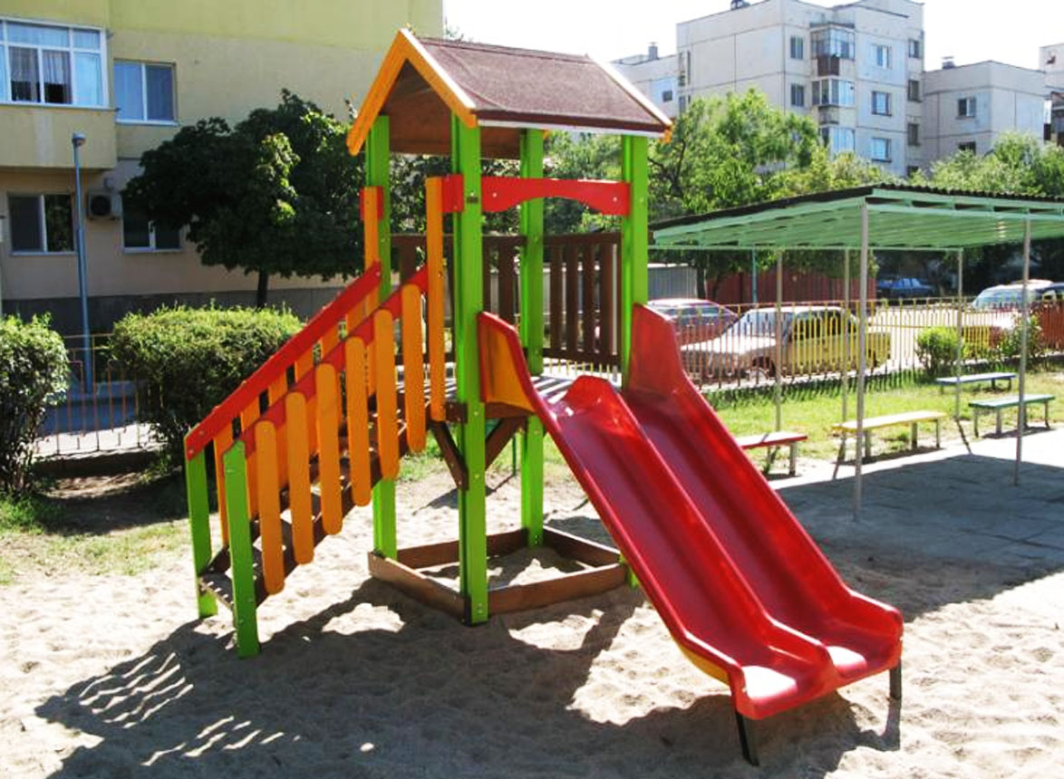 At the design and manufacturing stages we pay particular attention to product safety. The fresh colours and environmentally-friendly materials (high quality treated wood) allow us to make the best design solutions and to adapt the products as best as possible to the natural and urban environment. In order to achieve high game value of the facilities, we strive to include different game modules - climbing, swinging, sliding, crawling, hanging, balance keeping, group gathering, communication, role playing, etc. As a result of the excellent surface treatment (three layer coating with environmentally-friendly acrylic varnish suitable for outdoor conditions), the proper design solutions used and the reliable metal hardware and fasteners, the service use of the products exceeds 10 years. The warranty period of the equipment is 24 months. The playground equipment is designed, manufactured and installed in accordance with BS EN1176 and the requirements of Regulation No.1 of May 12th, 2009 on the Conditions and Procedures for the Playground Structure and Safety. The company is certified to design children facilities and playgrounds and issues all documents necessary for the commissioning of any facility.